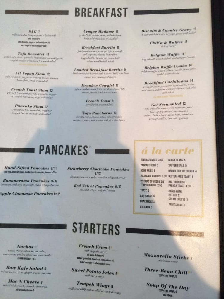 tofu scramble, sausage, hashbrowns, and seitan bacon with a choice of french toast or pancakes